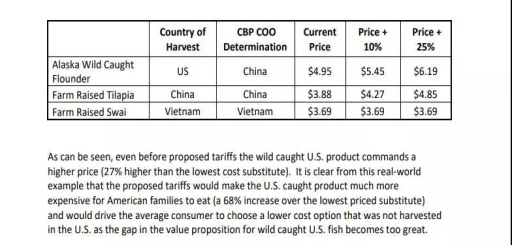 美國(guó)最大羅非魚進(jìn)口公司The Fishin’ Company(信世安)9月5日致USTR,請(qǐng)求將冷凍羅非魚片(HS:03046100)、冷凍粉鮭魚片(HS:03031200)、冷凍真鱈魚片(HS:03036300)、冷凍比目魚片(HS:03033901)和冷凍黑線鱈魚片(HS:03036400)等商品,從征稅名單中刪除。